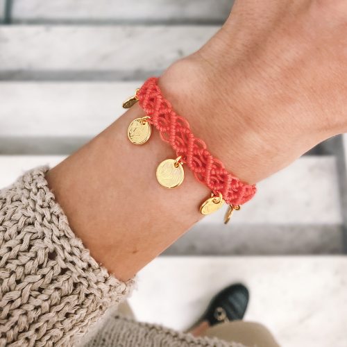 Handmade macrame bracelet with knotted cord, decorated with gold plated coins. Adjustable macrame ending. Nickel Free 24k Gold Plating (Hypoallergenic)